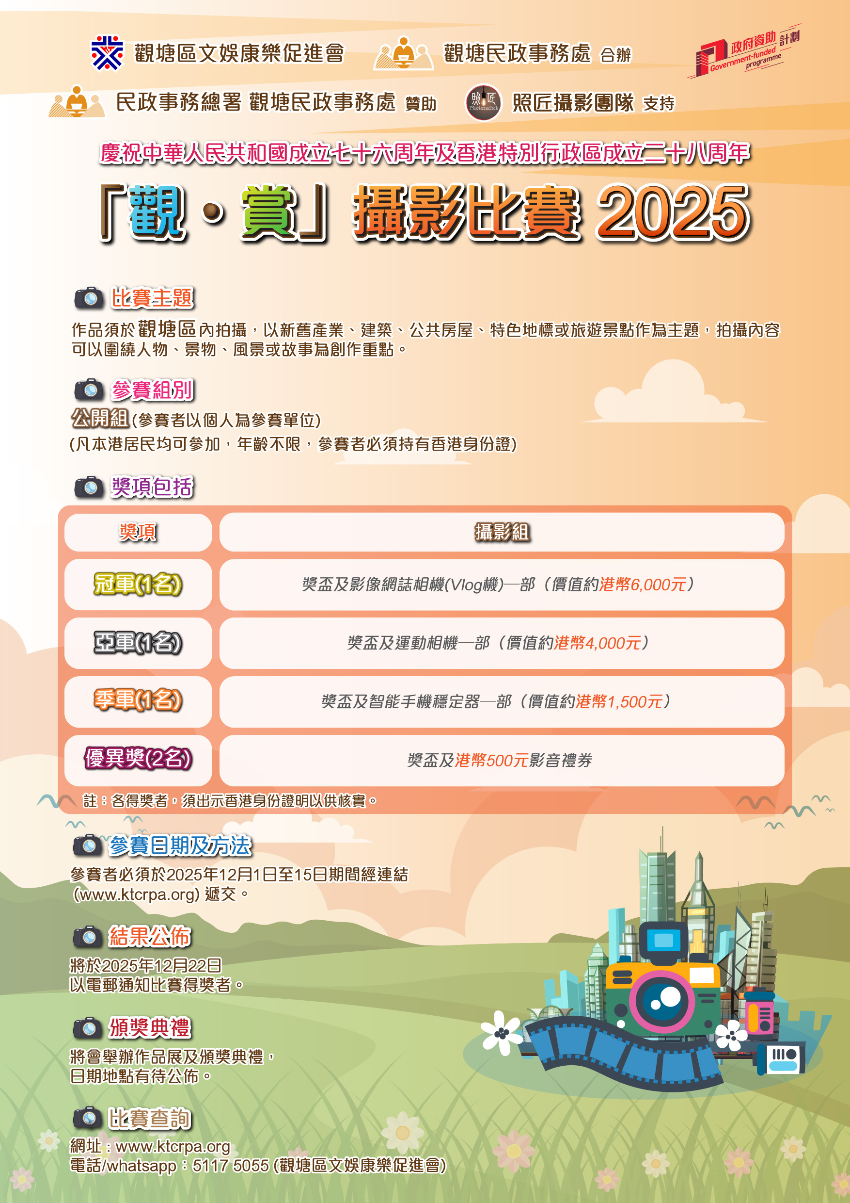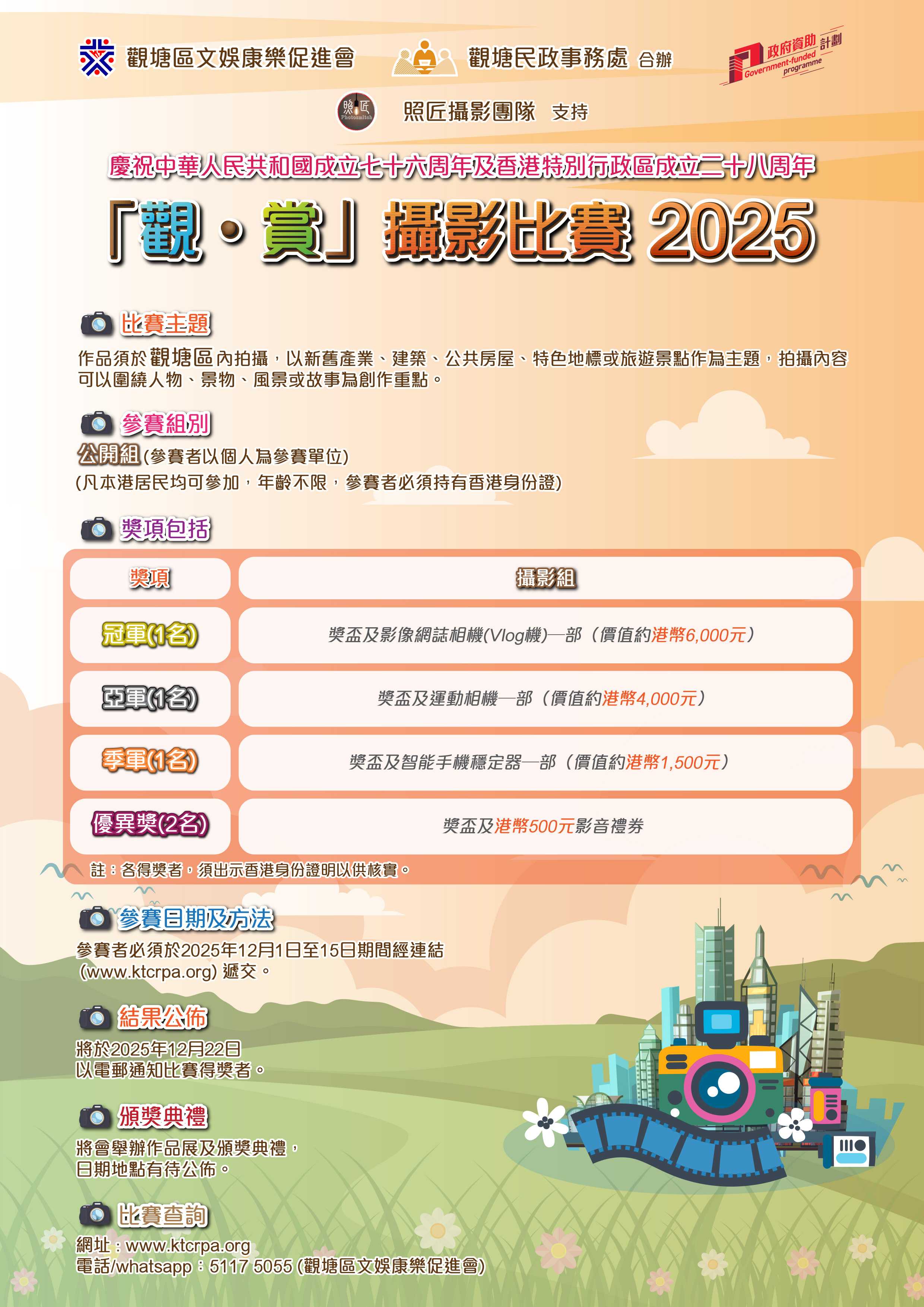 藉此,觀塘區文娛康樂促進會(下稱主辦單位)與觀塘民政事務處舉辦「觀‧賞」攝影,讓喜歡拍攝你,盡情發揮影像觸覺與攝製天份,在觀塘區內的場景、建築及人物風情留下精彩獨特的影像。參賽作品將由評審團按評分準則,選出為冠、亞、季軍及優異獎,得獎者即贏取豐富獎品。